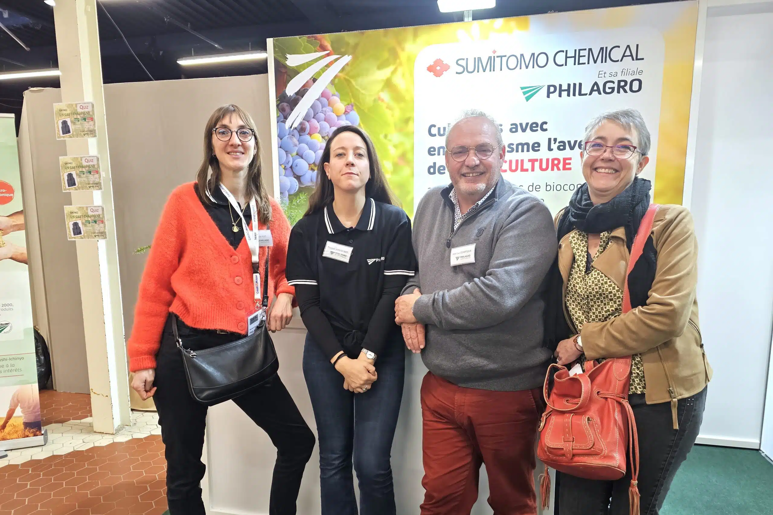 L’équipe Philagro : Camille Huet, responsable marketing cultures pérennes, Pauline Vuillecard responsable communication agrosolutions, Jean-Luc Comptour, ingénieur de développement technique. À droite : Cécile Tessier, responsable filière, Sumitomo Chemical.
