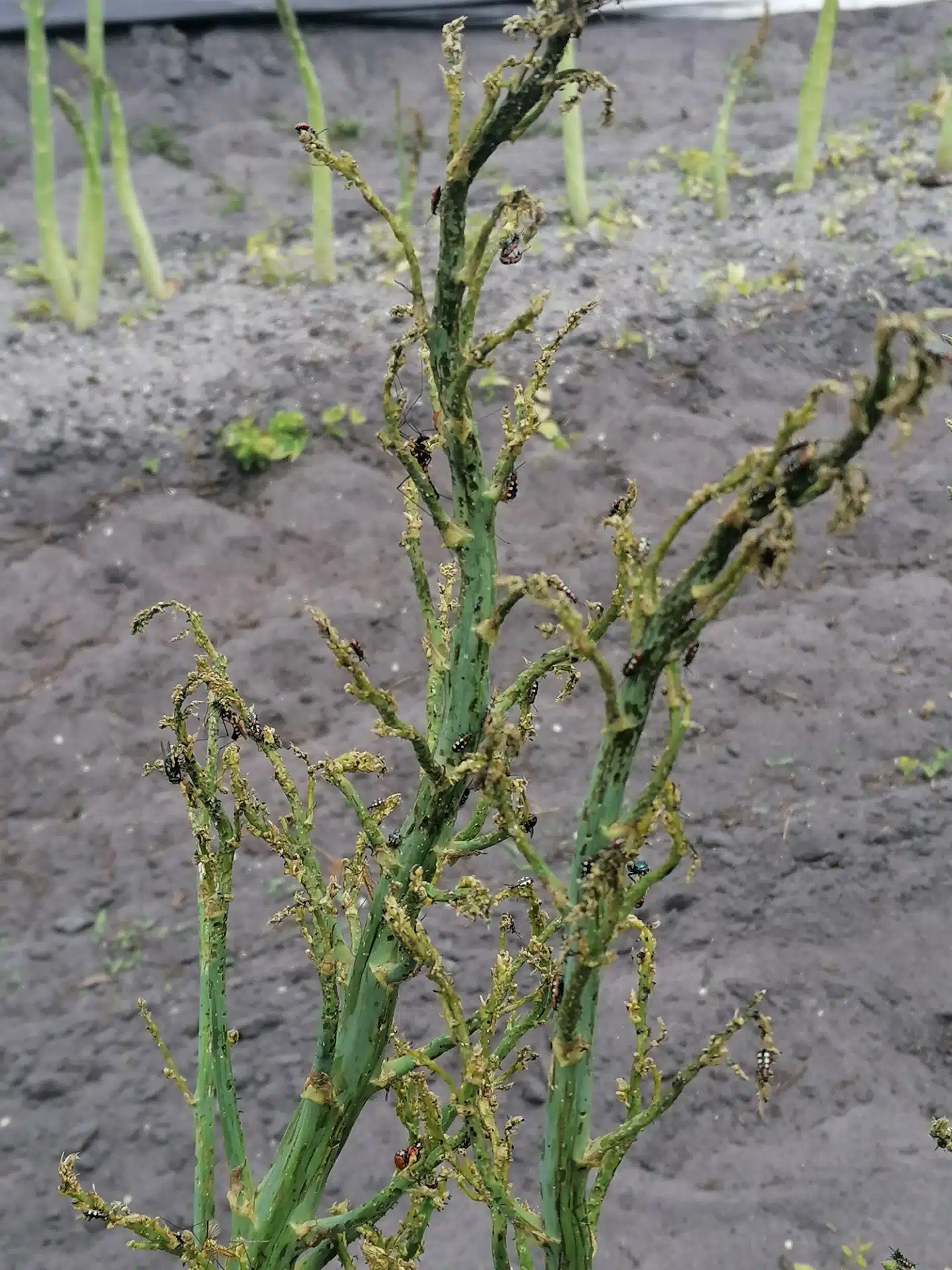 En cas de forte infestation, les pertes de rendement peuvent s’étendre sur plusieurs campagnes successives, menaçant la rentabilité de la culture. Les cas de très forte infestation peuvent aboutir au dépérissement de l’aspergeraie.
