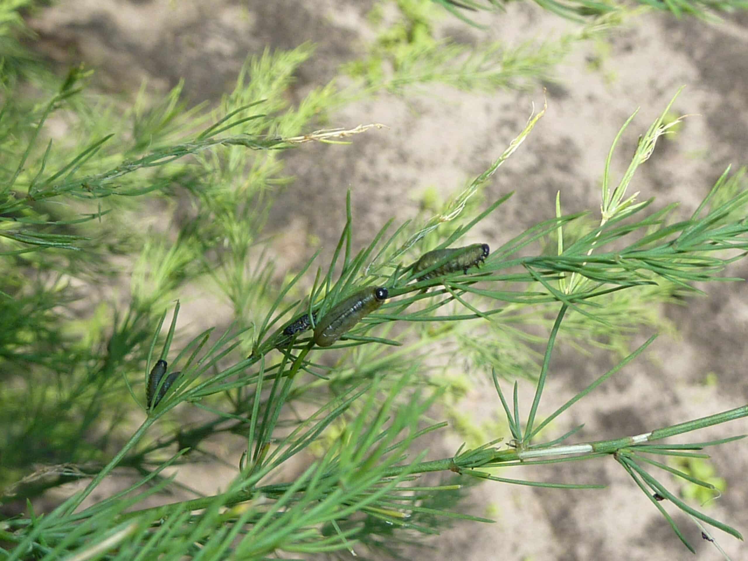 Après l’éclosion, les larves — reconnaissables à leur corps mou recouvert de mucus noirâtre — se nourrissent intensément du feuillage. Ce sont elles qui causent le plus de dégâts. Une fois arrivées à maturité, elles rejoignent le sol avant la pupaison.