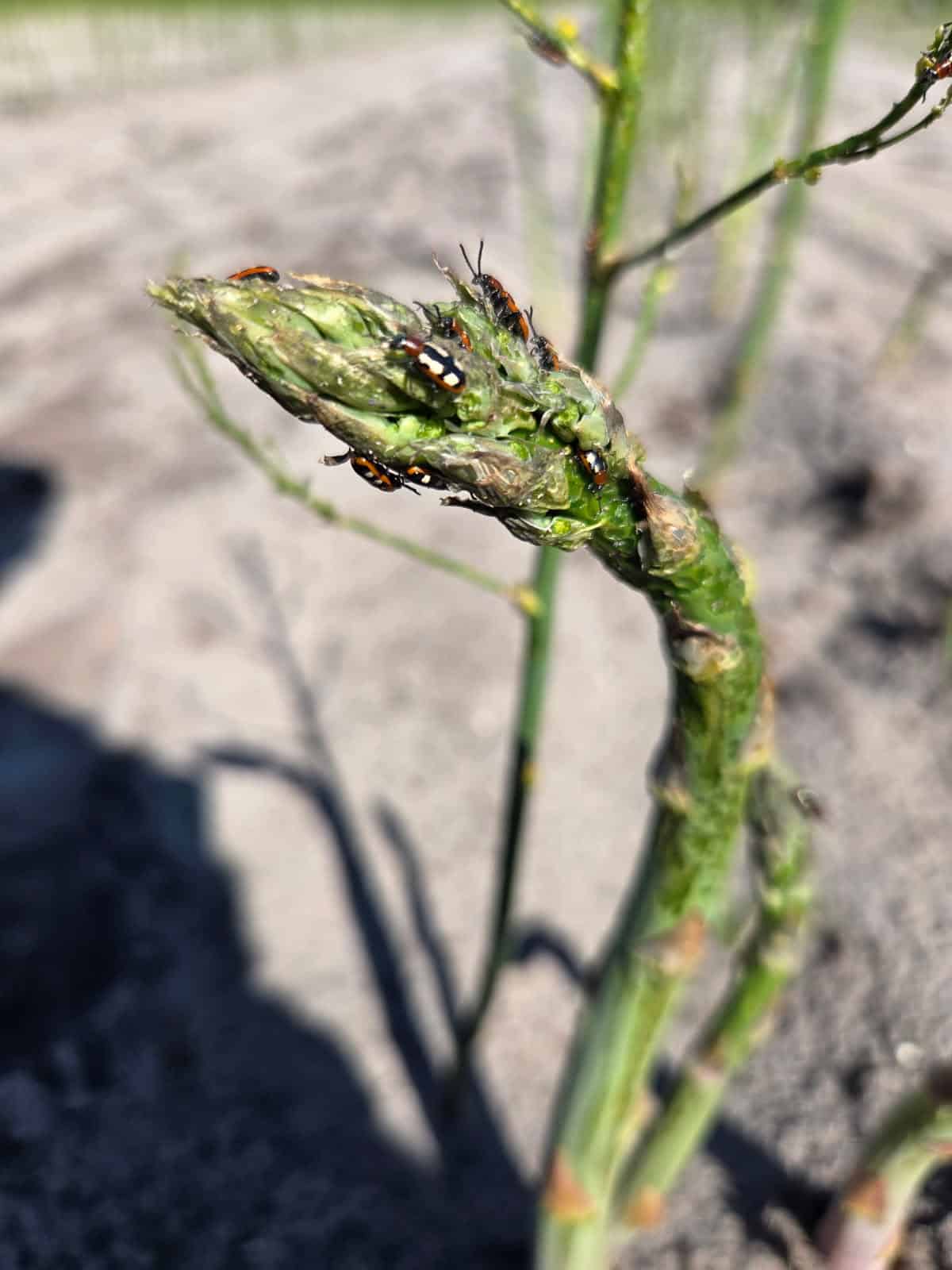 Les dommages causés par le criocère sont doublement problématiques pour les producteurs d’asperges.